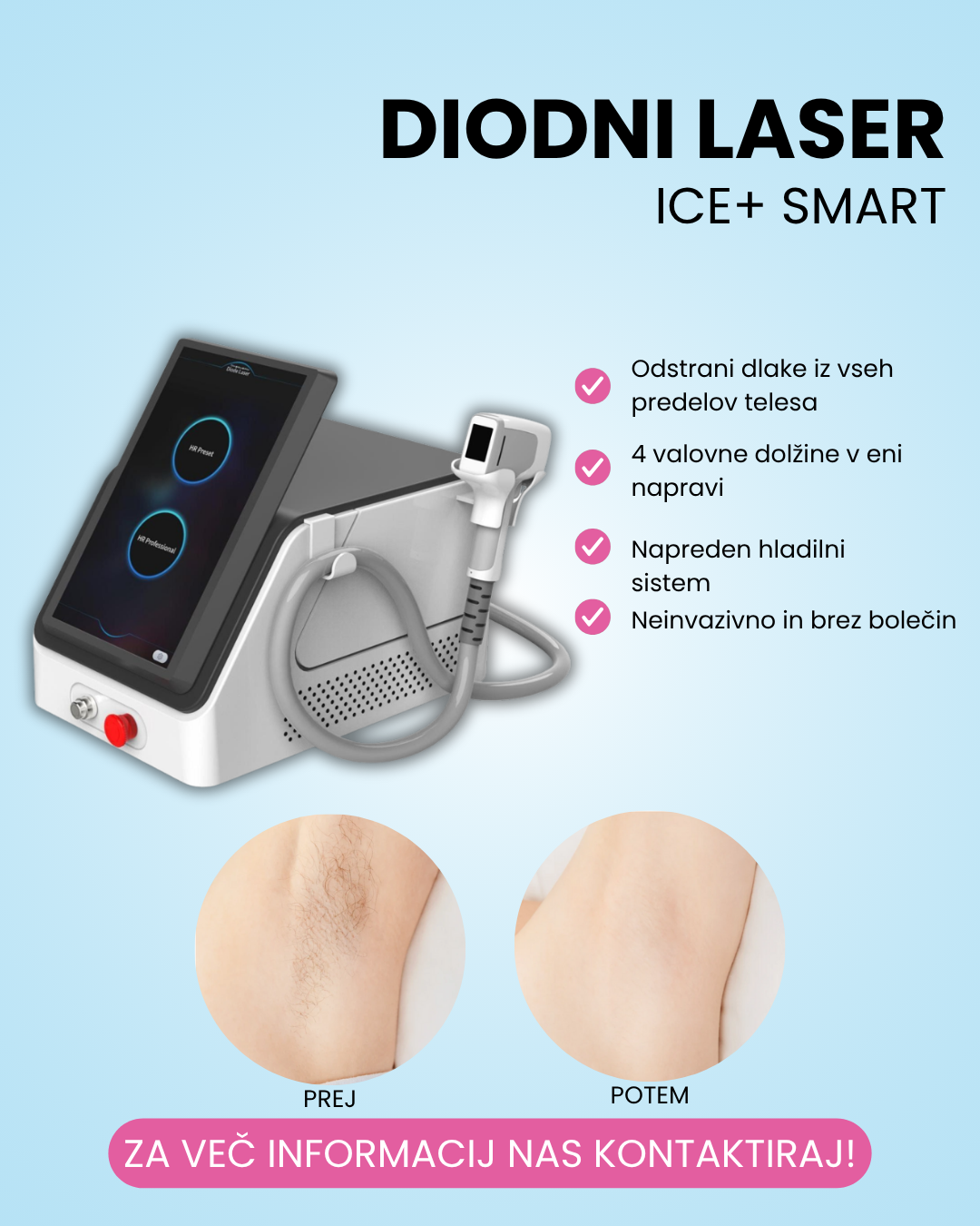 Ne propustite priliku i iskusite najnapredniju tehnologiju laserskog uklanjanja dlaka. Diodni laser ICE+ SMART je vaš put do glatke i besprijekorne kože – brzo, sigurno i bezbolno.